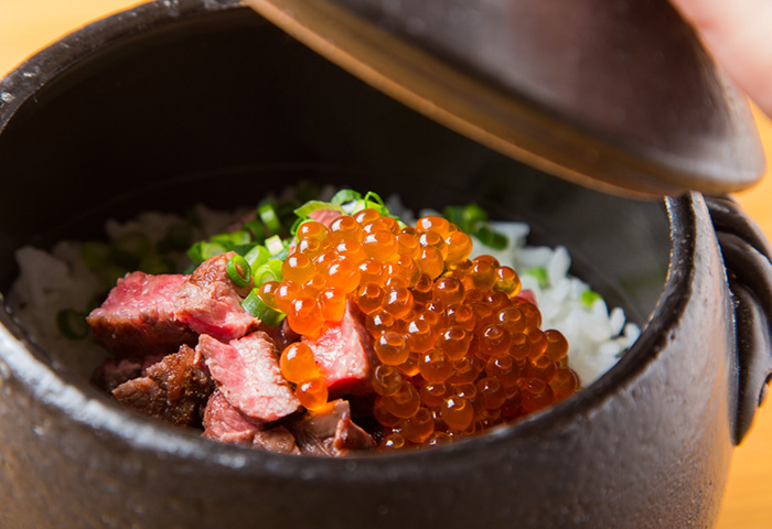 当店自慢の逸品である“土鍋ごはん”。その中でも特に人気を集める一品が“霜降り和牛のいくらぶっかけ”です。宮崎牛の霜降りと大粒のいくらを贅沢に使用。羅臼の昆布と枕崎の鰹節のシンプルな一番出汁の旨味による、素材の持ち味を存分に感じていただけます。